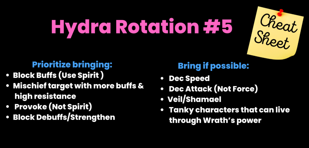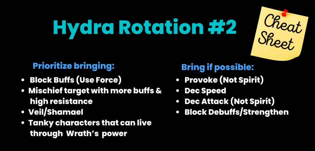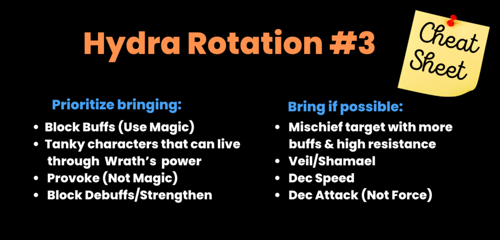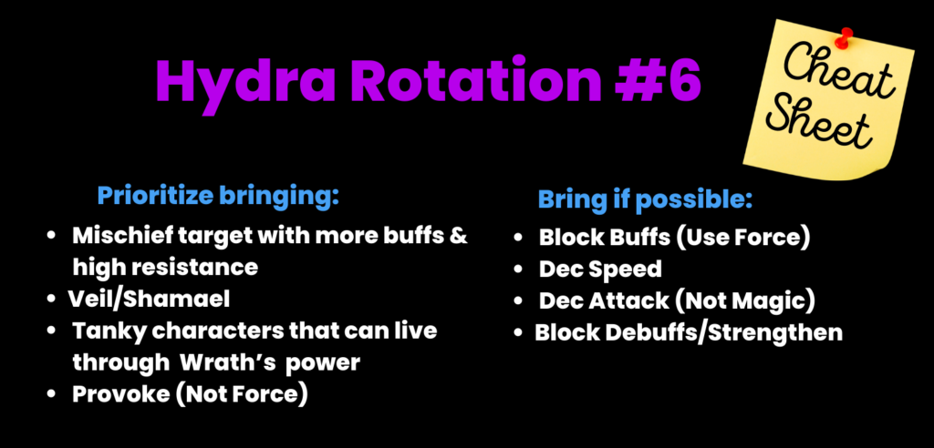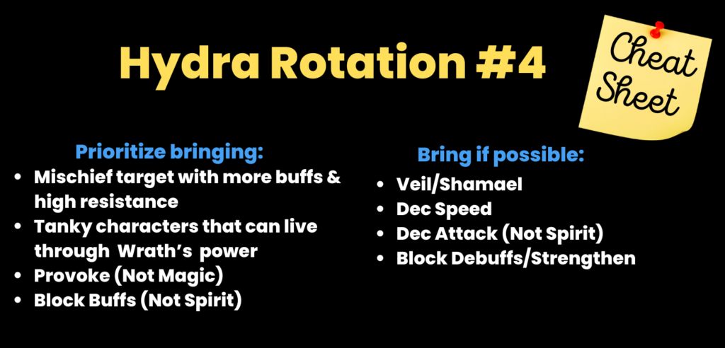 Fourth and most importantly always do hydra manually if you want to get highest scores. Running auto teams will without a doubt end in a wipe and unlikely let you reach your highest potential. Lastly given the amount of mechanics hydra throws at you it may not be feasible for you to deal with all of them (or even half) therefore pick out those which you can handle and pucker your butt while going through the rest because it is going to be a bumpy ride.